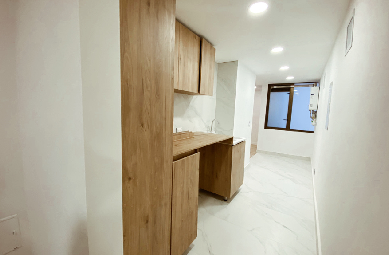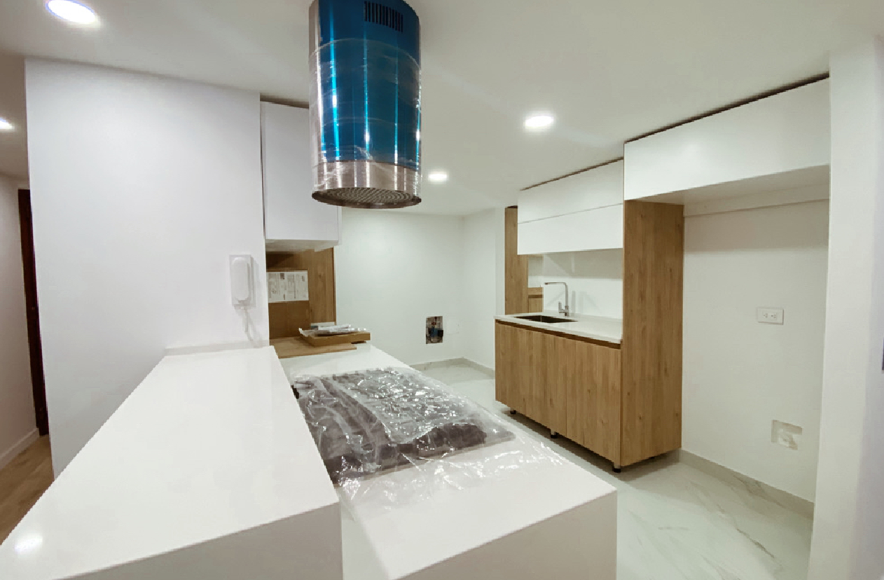 Reubicación de la cocina: trasladamos la cocina, originalmente ubicada al fondo del apartamento en un espacio estrecho y cerrado, hacia la zona social. Logramos un ambiente moderno, abierto y confortable, adaptado a las necesidades de la familia.